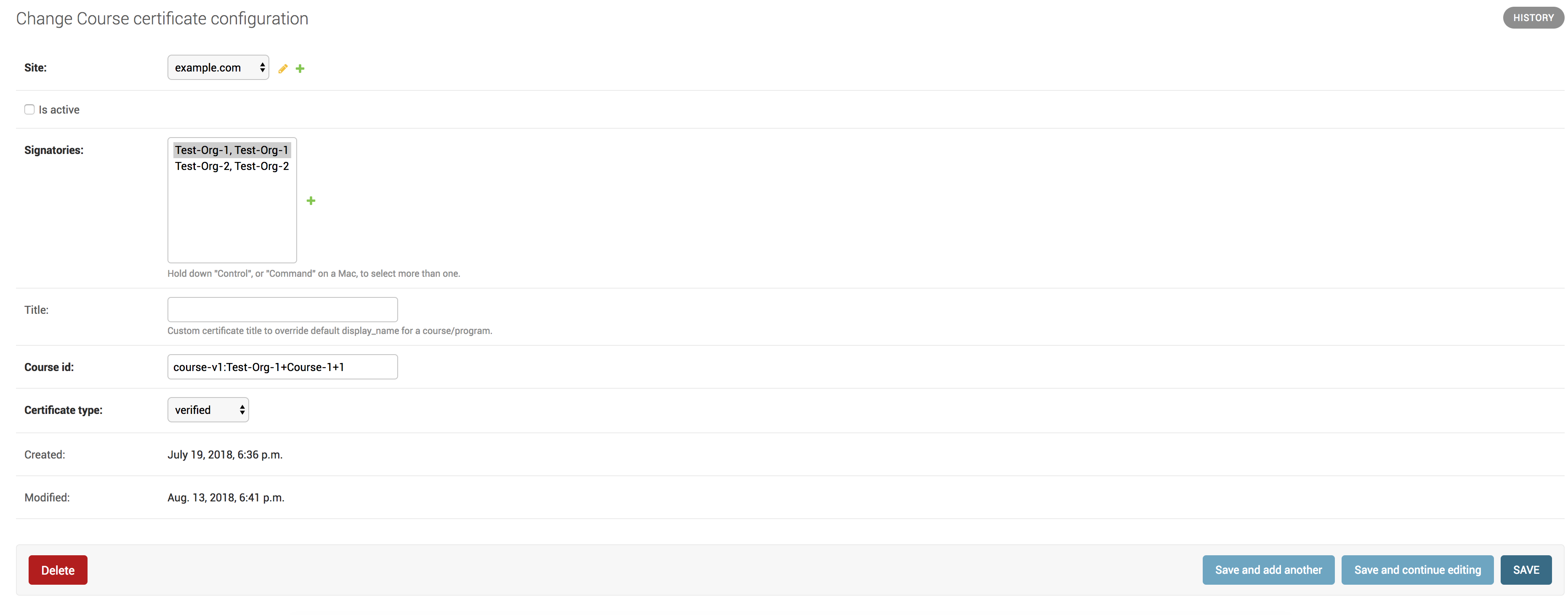 The following image shows the CourseCertificate model in the Django administration panel for a configured course certificate.