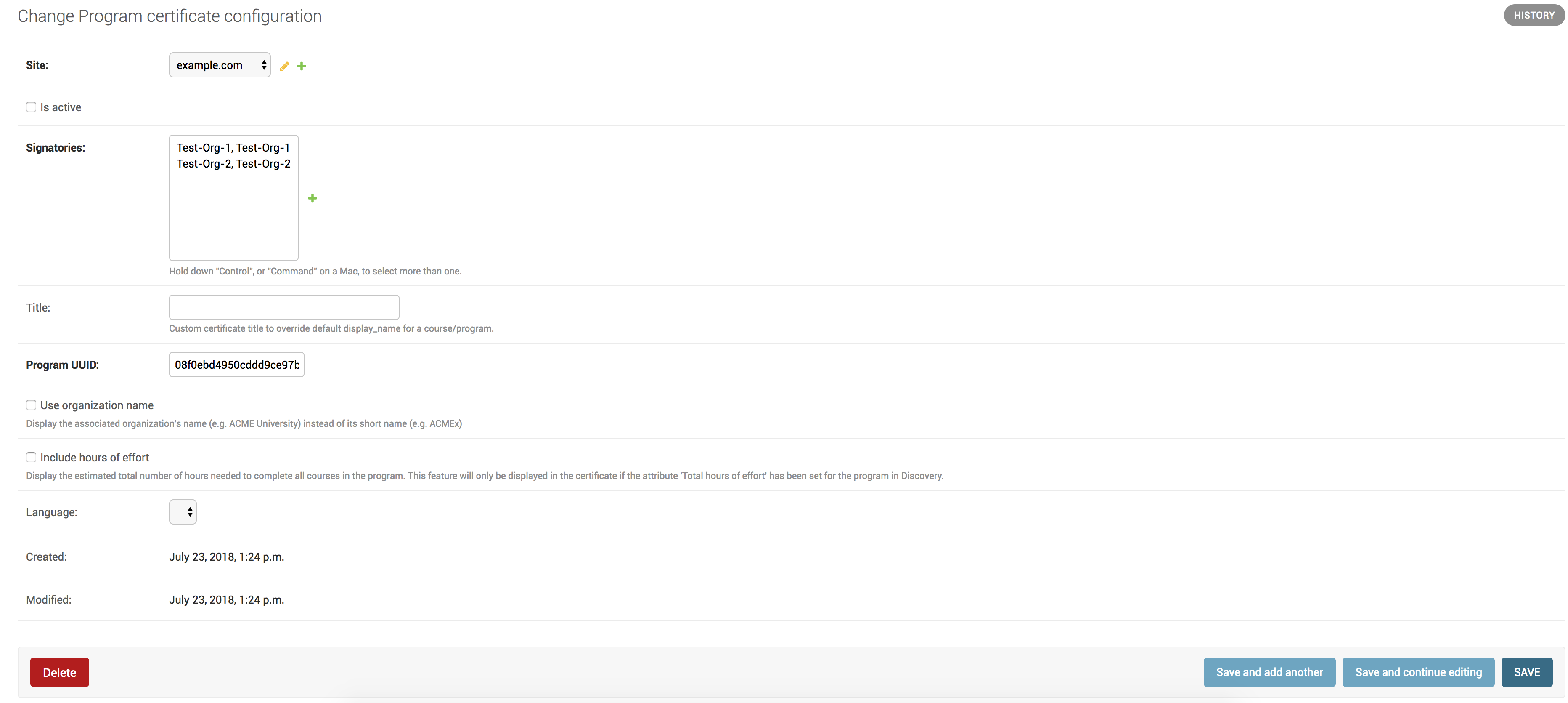 The following image shows the ProgramCertificate model in the Django administration panel for a configured program certificate.