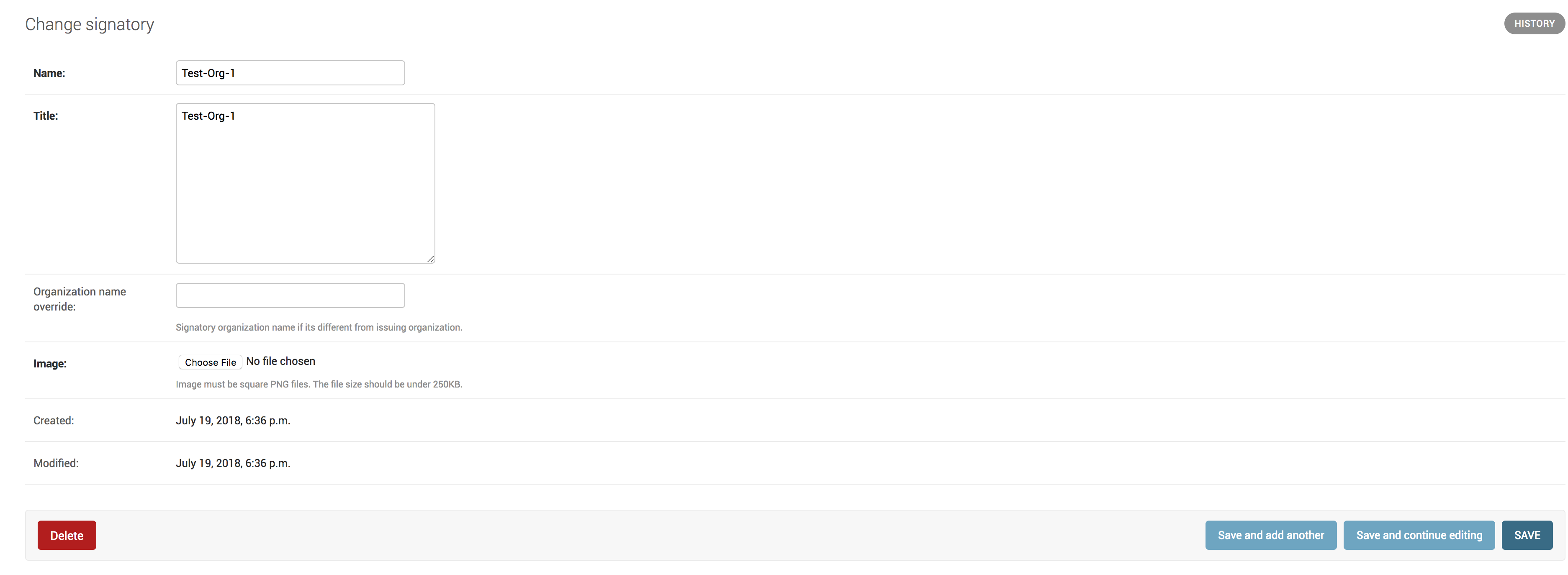 The following image shows the Signatory model in the Django administration panel for a configured signatory.