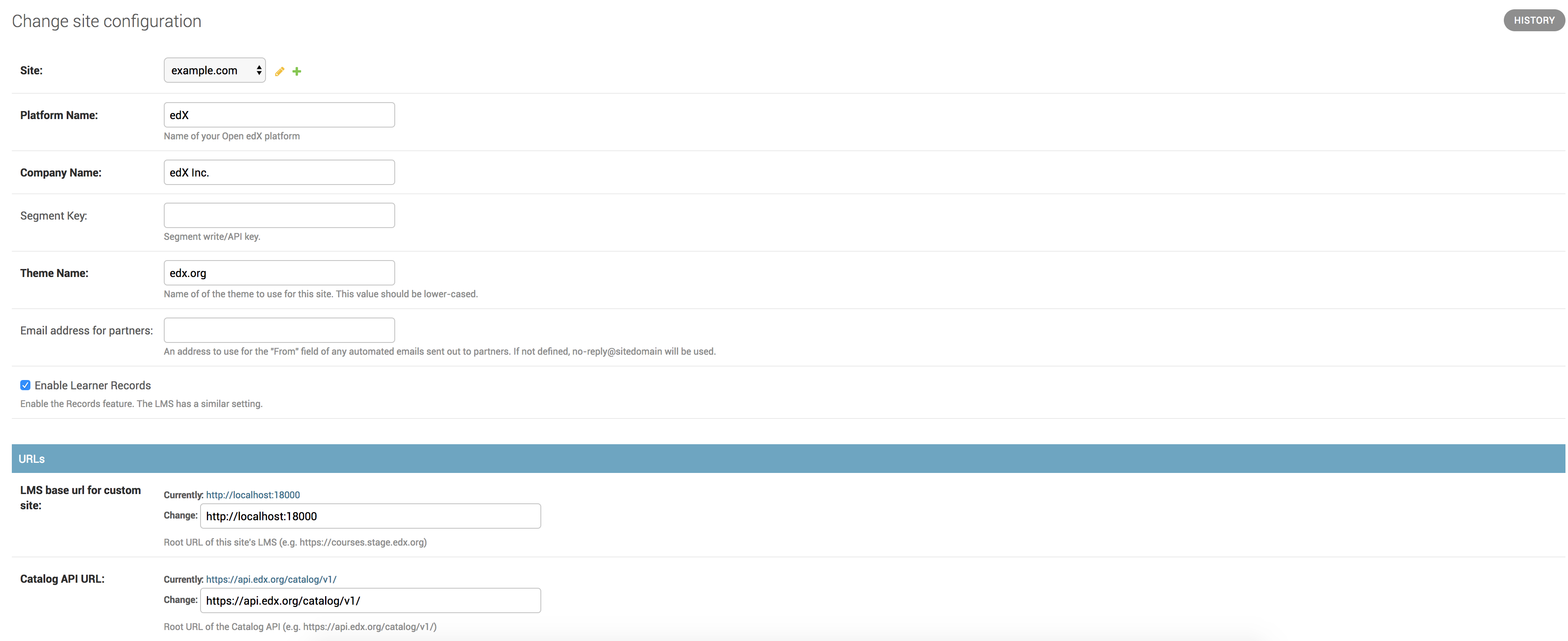 The following image shows some of the fields in the SiteConfiguration model in the Django administration panel