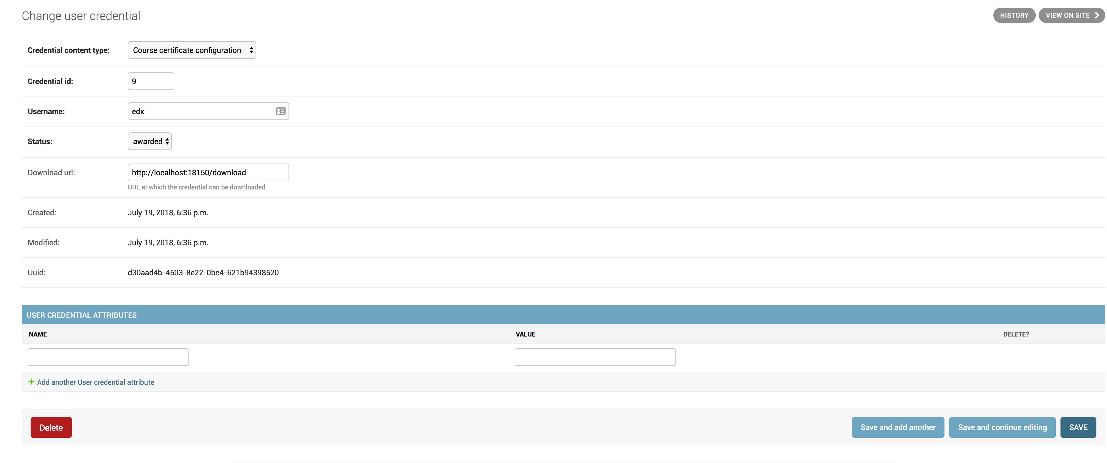 The following image shows the UserCredential model in the Django administration panel for a configured user