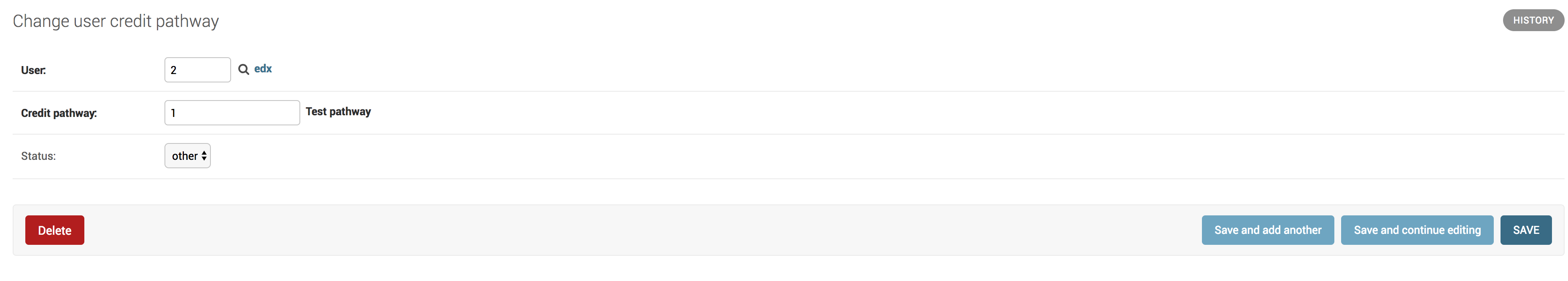 The following image shows a configured UserCreditPathway model in the Django administration panel.