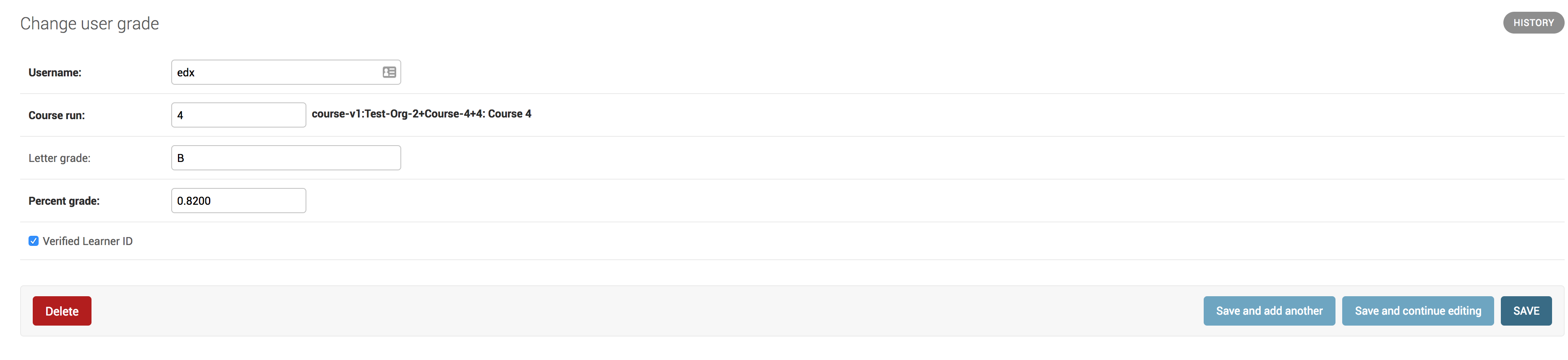 The following image shows a configured UserGrade model in the Django administration panel.