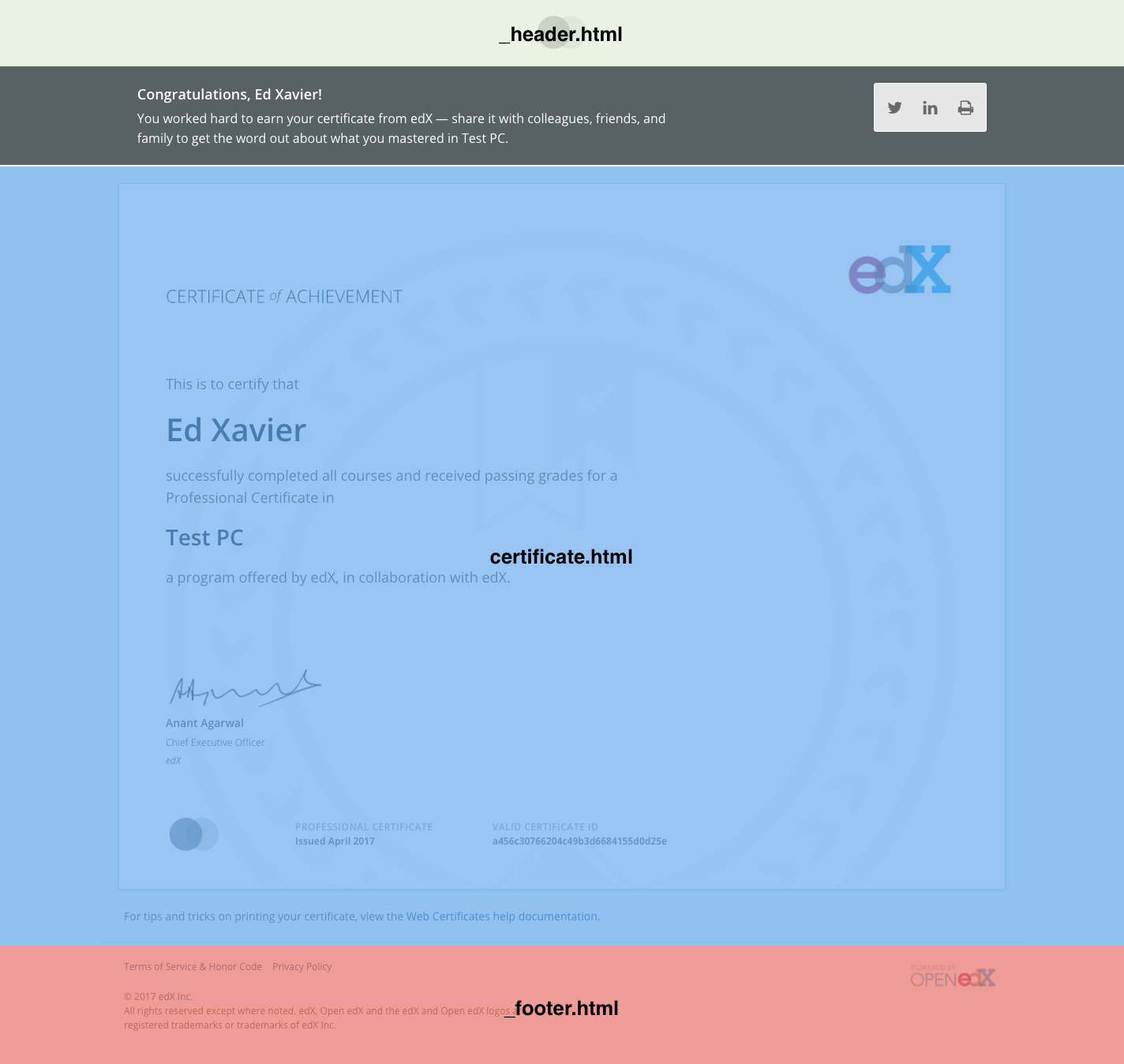 LC_MESSAGES, should be lowercase to avoid issues that might occur when you are developing on case-insensitive environments (e.g. macOS) and deploying to case-sensitive environments (e.g. Linux). TheLC_MESSAGESdirectory is an exception to this rule, as Django convention requires it to be all uppercase. See How Django discovers translations for more information.The rendering view is specifically looking for files named certificate.html, _footer.html, and _header.html. If you use different file names for these components, they will not be rendered.